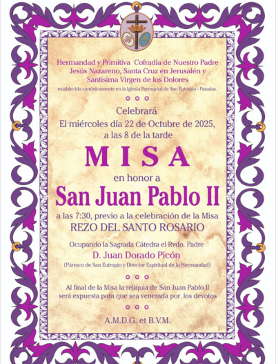 🟣 MISA SAN JUAN PABLO II ⚫ El día 22 de octubre, la Santa Iglesia Católica celebra el día de San Juan Pablo II, del cual nuestra Hermandad posee una Reliquia de primer grado. Por ello, tal como dictan nuestras Reglas, se celebrará (D.m.) Solemne Misa en...