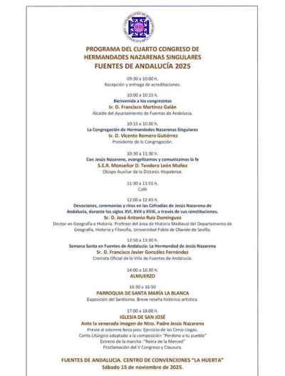El sábado 15 de noviembre, tendrá lugar el congreso organizado por la Congregación de Hermandades Nazarenas Singulares, de la que nuestra Hermandad es miembro fundador.